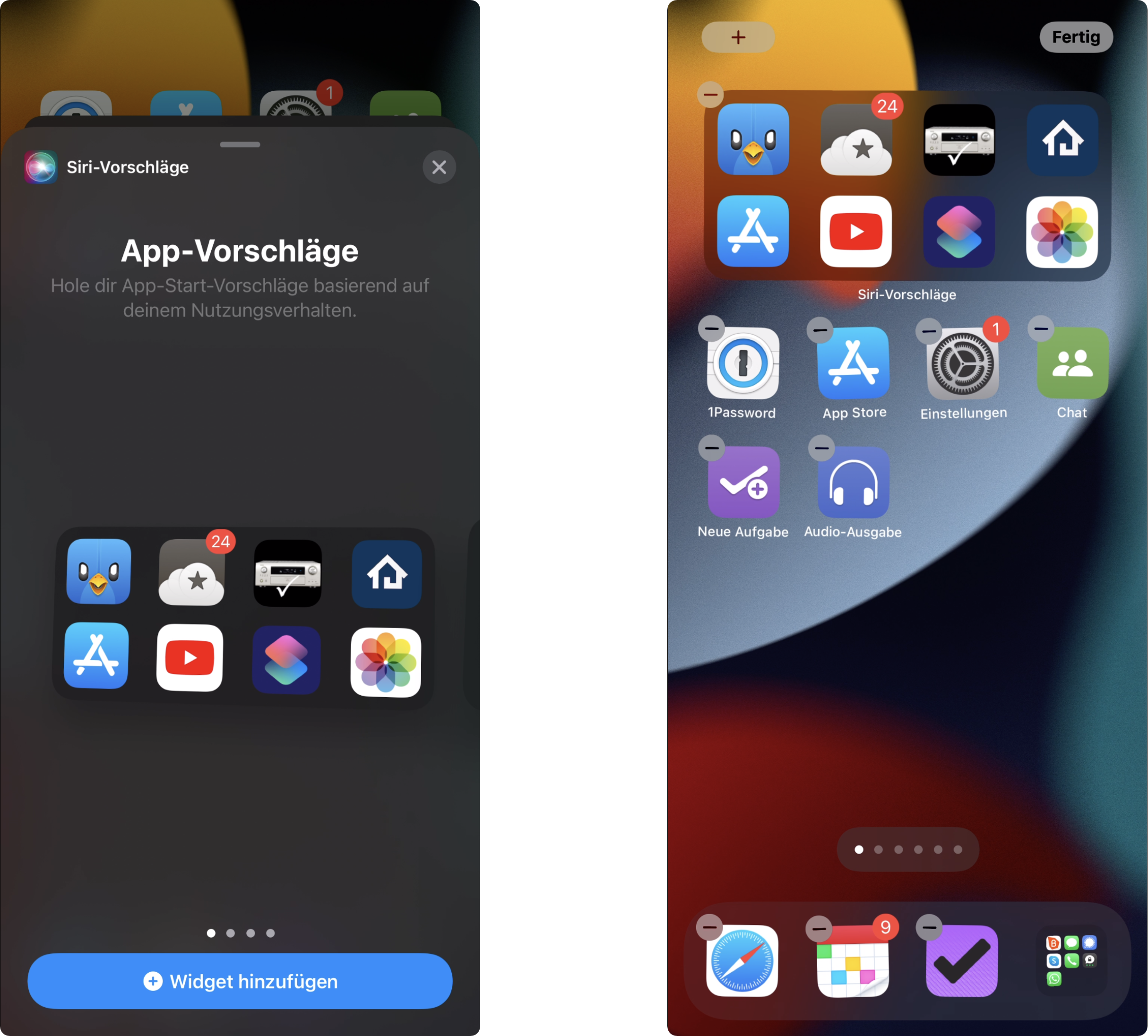Was ansonsten wichtig ist hängt von Tag und Tageszeit ab. Du brauchst zum Beispiel tagsüber Apps für die Arbeit und den Weg dorthin, Abends eher Netflix und am Wochenende die Stadion-App. Natürlich kannst Du für jedes Szenario eine eigene Seite anlegen. Mit dem Widget „Siri-Vorschläge“ geht es aber einfacher.